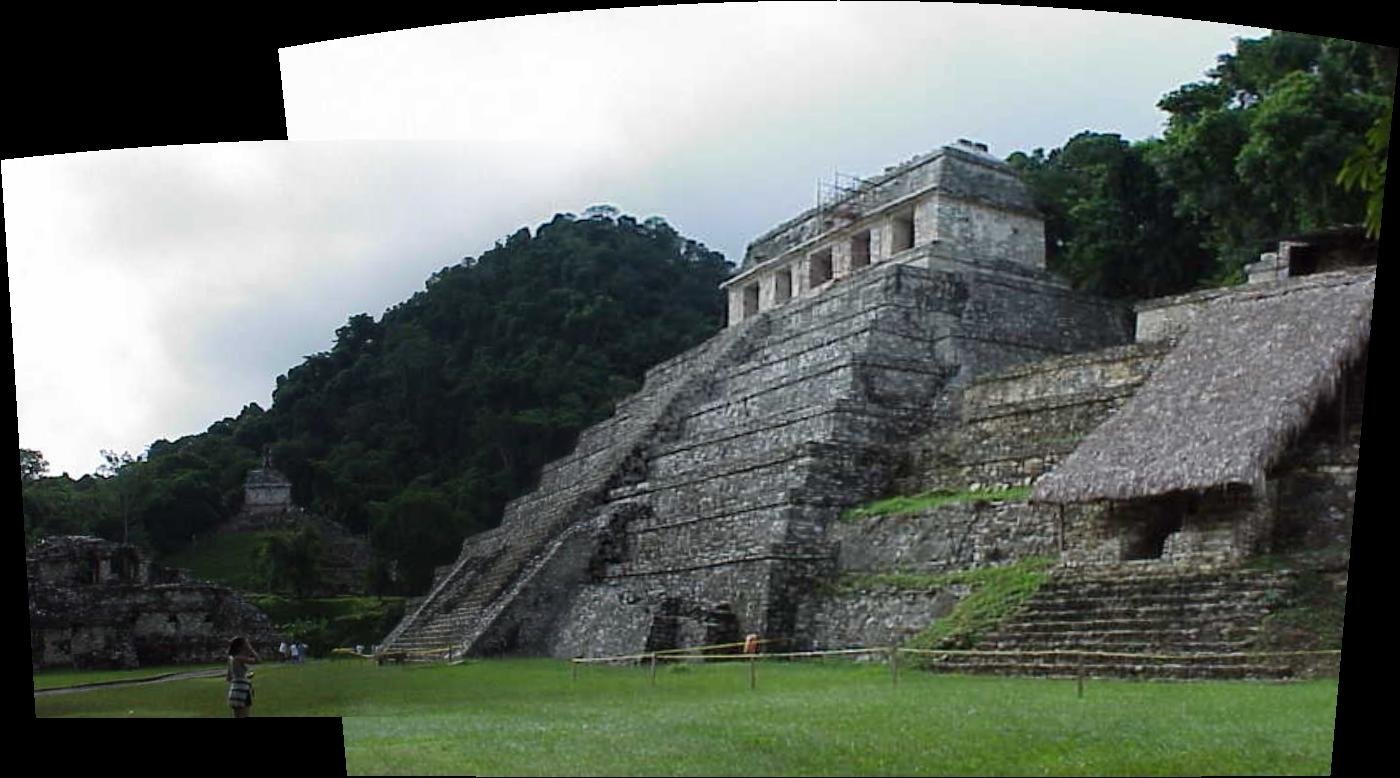 To the right is the east end of the Temple of the Inscriptions. In the center is the Temple of the Sun. To the left is south end of the Palacio. 2000